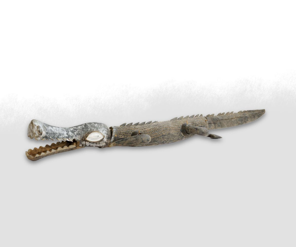 Woher das Krokodil stammt und wie es nach Lübeck kam, ist unbekannt. Im Archiv von KOLK 17 gibt es keine Aufzeichnungen zu dieser Figur. Durch Fotos der Ausstellung im alten TheaterFigurenMuseum Lübeck lässt sich nur nachweisen, dass sie vor 1998 in die Sammlung gekommen sein muss. So geht es KOLK 17 mit vielen Sammlungsobjekten: Das meiste ist bisher noch unklar.