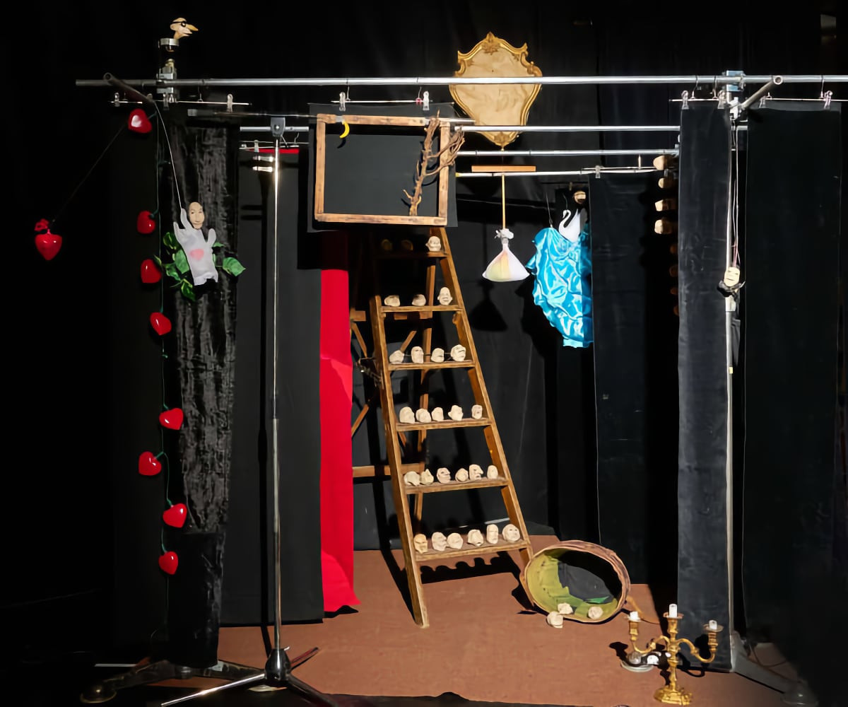 Eine Bühne aus Rohrgestell und Hosenbügeln mit schwarzen Stoffbahnen, 40 Köpfen und noch vielen weiteren Requisiten versteckt nichts. Die zwei nackten Hände der Spielerin Kristiane Balsevicius bilden im Stück „LIEBE und das ganze Theater“ die Körper der Figuren. Sie treten zum Thema Liebe in unterschiedlichen Rollen auf: als Singles, Verlassene, Alte und Verträumte.