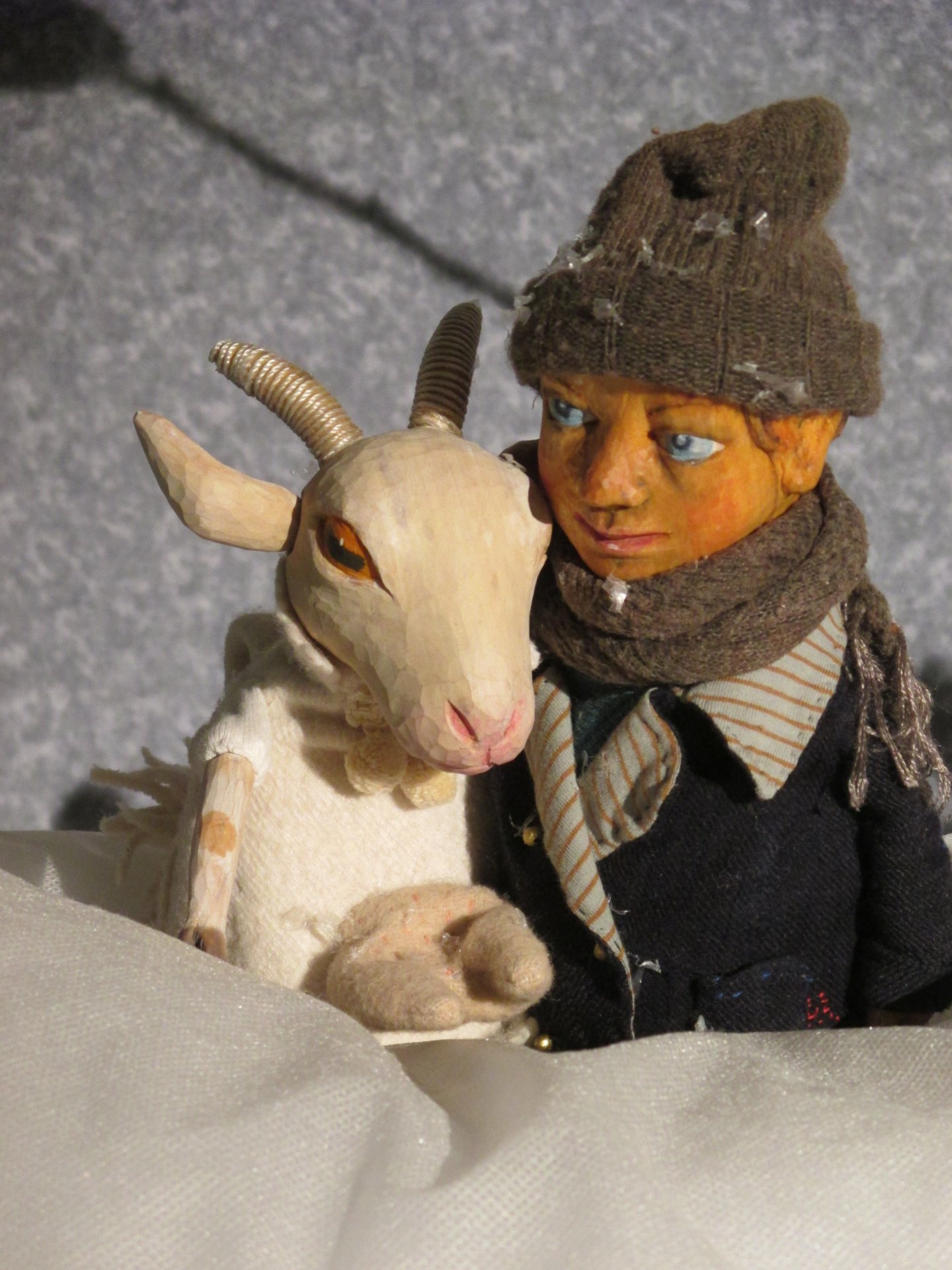 Ein Junge mit seiner Ziege im Schneesturm