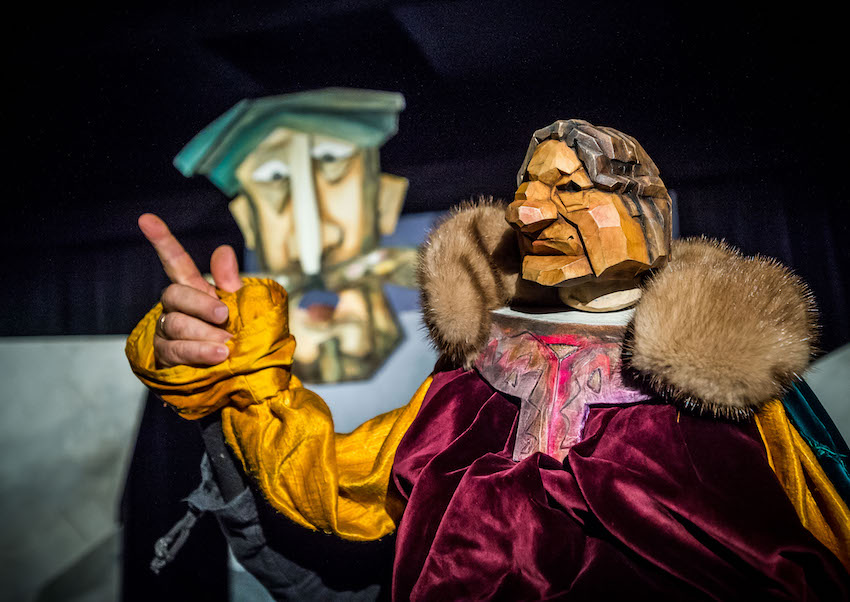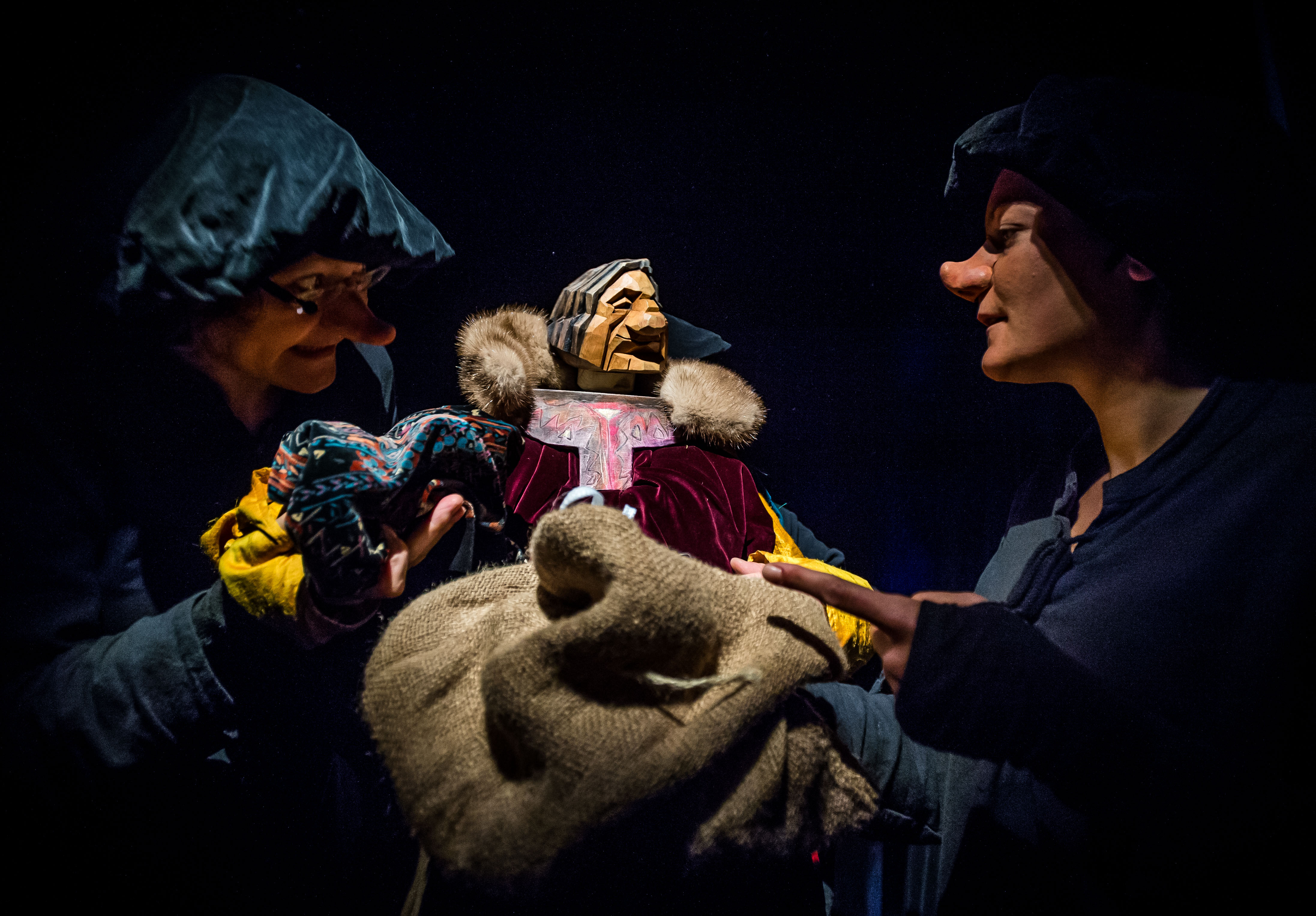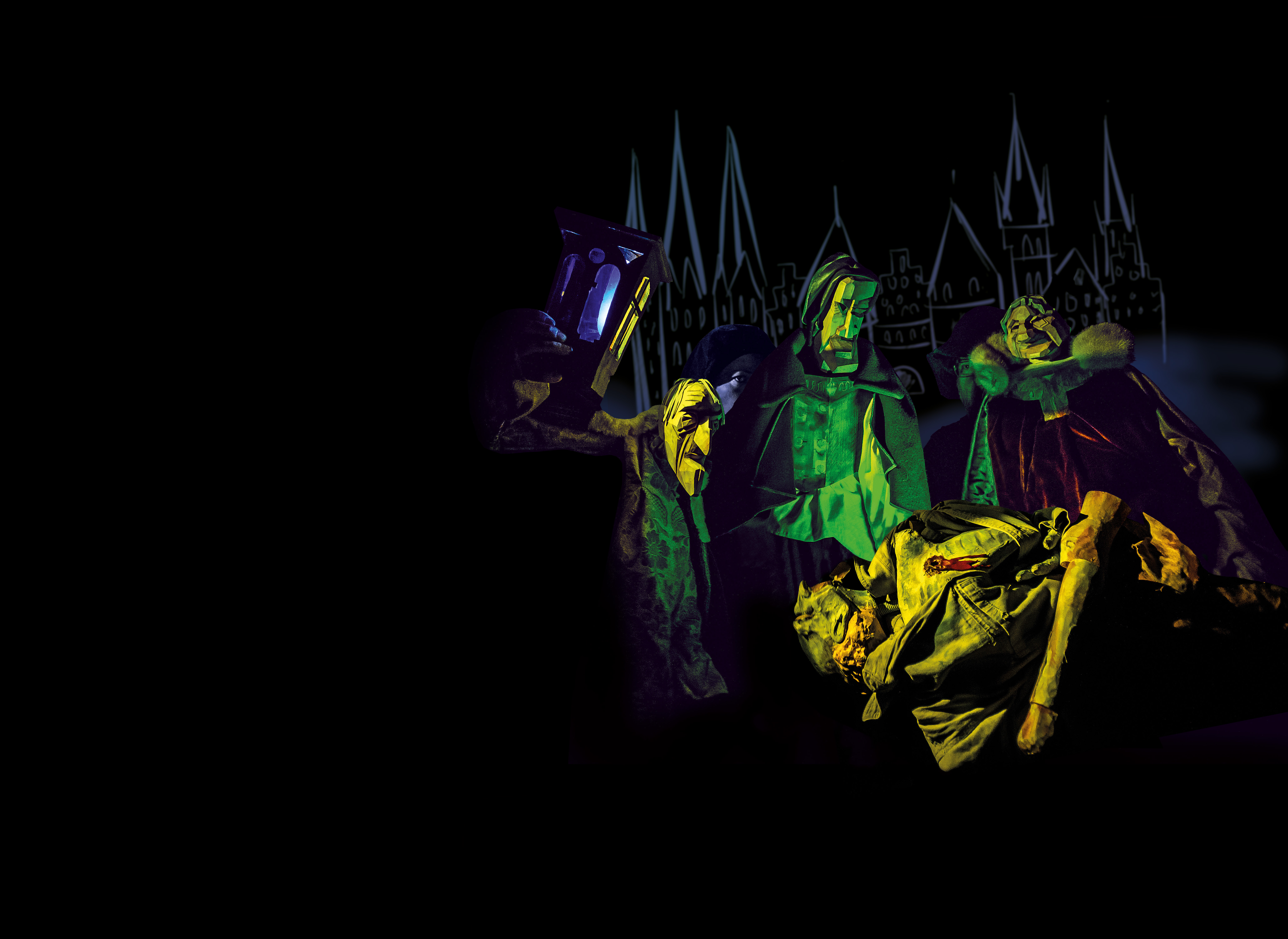 Große Stockhandpuppen in detailreichen historischen Kostümen schleichen durch Projektionen. Scharfkantige Lindenholzgesichter lauern um große rollbare Paravents herum, die zugleich die Projektionsflächen für Stop-Motion-Filme sind: Innere Vorgänge der Figuren wie Wünsche, Hoffnungen, Pläne und (Alp-)träume werden wortlos sichtbar und sind die Bildkommentare zum spannend und humorvoll sich entwickelnden Drama.