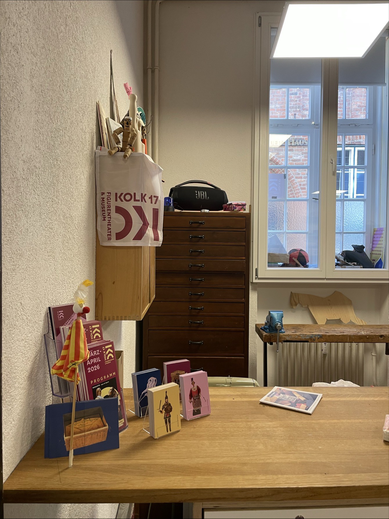 Die Werkstatt im KOLK*Peter ist kein abgeschlossener Raum, sondern ein Übergang: zwischen Ausstellung und Bühne, zwischen Idee und Umsetzung, zwischen unbelebtem Material und lebendiger Figur. Sie ist ein Ort für alle, die wissen wollen, wie Theater entsteht – oder es einfach selbst ausprobieren möchten.