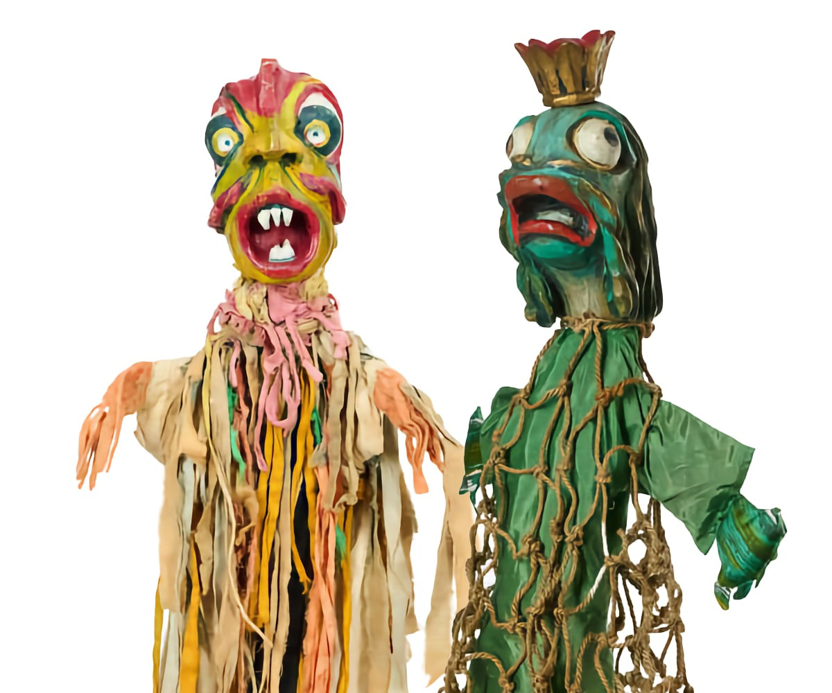 Fairytale stories, grotesque faces and unusual costume materials such as netting and fringes make these puppets scary and vivid. Art teacher Benno Petersen and journeyman painter and puppeteer Karl Pechascheck performed together in their local dialect, Low German, in the Lübeck region.